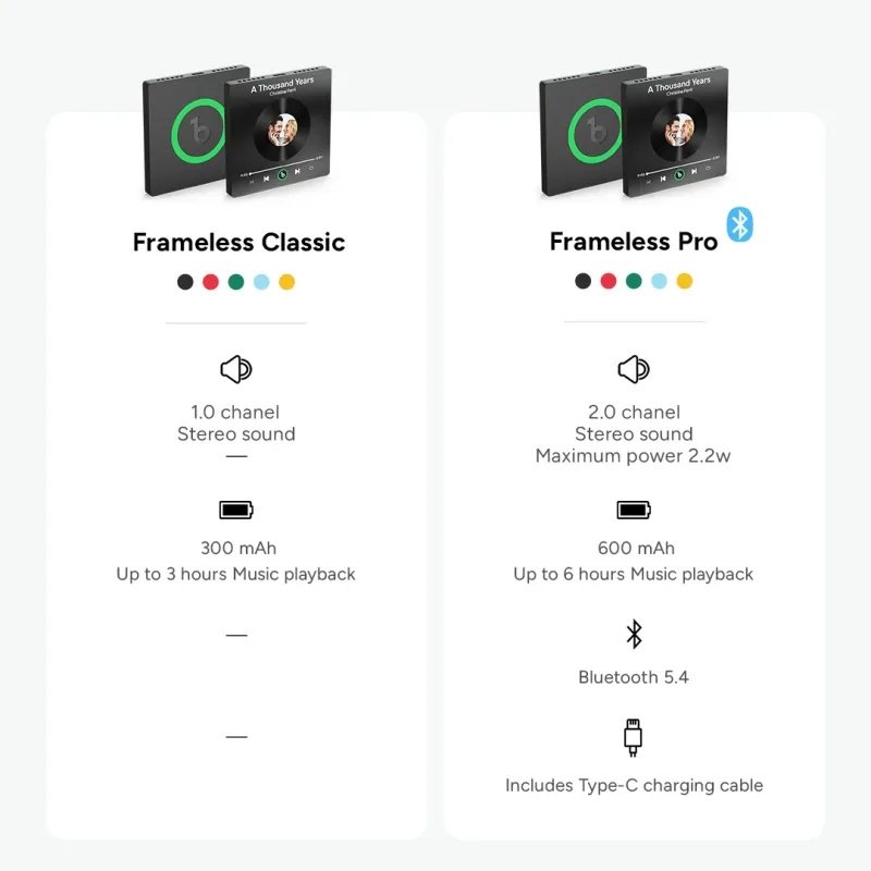 | Version | Classic – 3 Hours Music Playback, Pro – Bluetooth 5.4 & Stereo Sound |