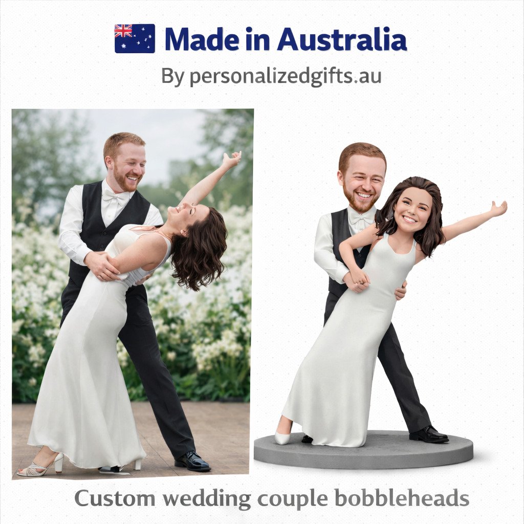 Celebrate your special day with a custom bobblehead featuring the groom holding the bride in a romantic dance pose. This personalized figurine, complete with engraved text, is a unique and heartfelt keepsake, perfect for commemorating your wedding day.