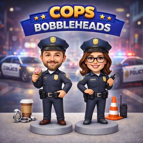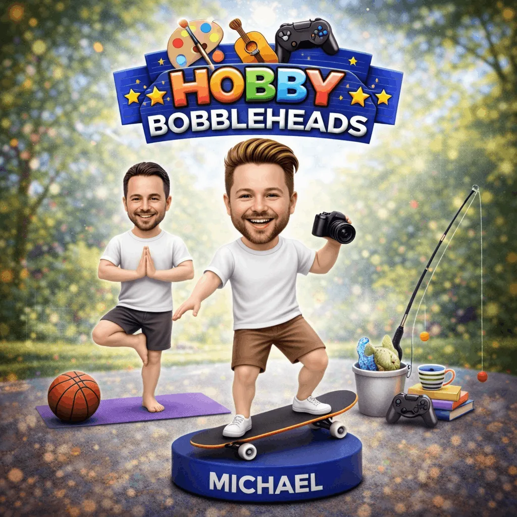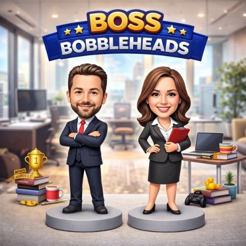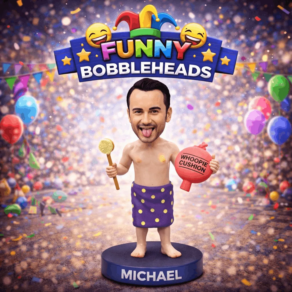 Custom bobbleheads are handcrafted figurines made to resemble a real person based on the photos you upload. Each bobblehead features a personalised face, hairstyle, outfit, and pose, finished with a classic bobbling head for added fun and character.