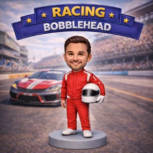 - Custom-designed bobblehead resembling a racer in full gear