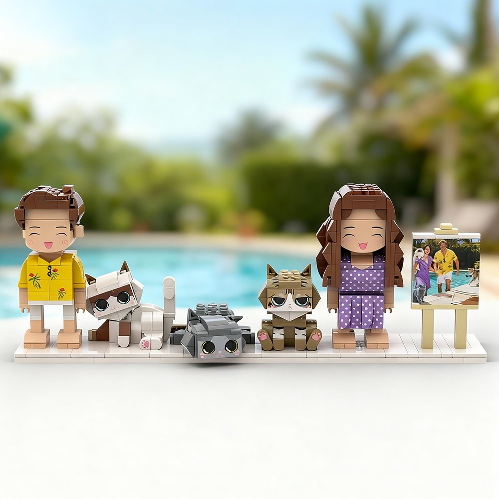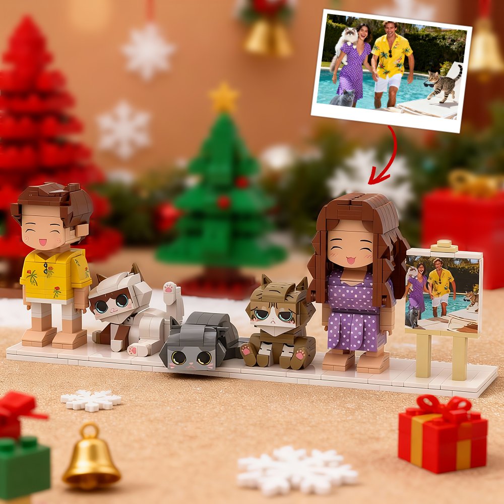 Custom Full-Body Cute Brick Figures | 2 People & 3 Cats with Frame