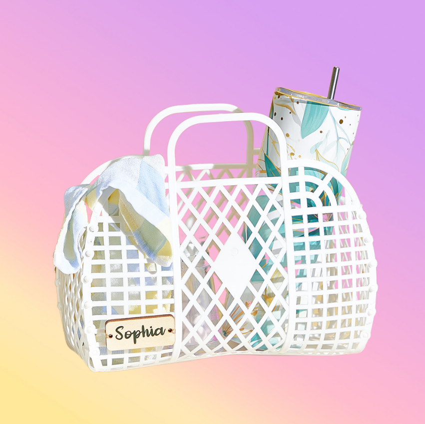 Carry your essentials in style with this Personalized Wooden Name Tag White Plastic Mesh Basket, designed for beach days and casual outings 🌊✨ Featuring a custom engraved wooden name tag, it adds a personal and practical touch to your summer accessories.