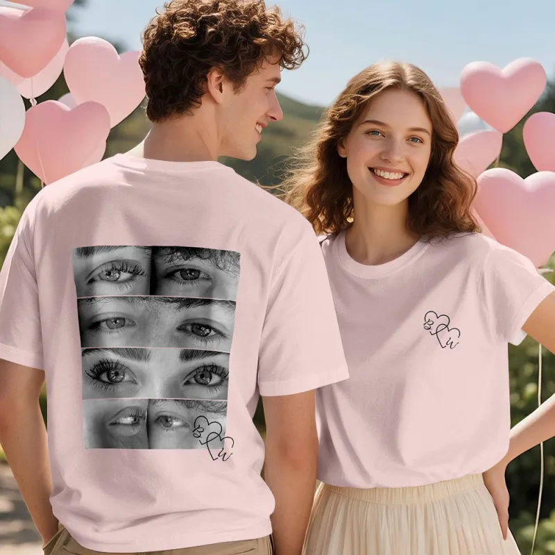 Celebrate your love with a Valentine Couple T-shirt, personalized with your photo in black & white and a unique eyes design. A perfect Valentine’s Day gift for couples.